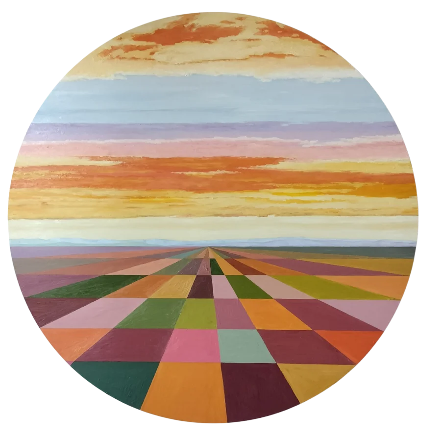 Pintura al óleo sobre bastidor artesanal de madera redondo, con diámetro de 87 cm.
