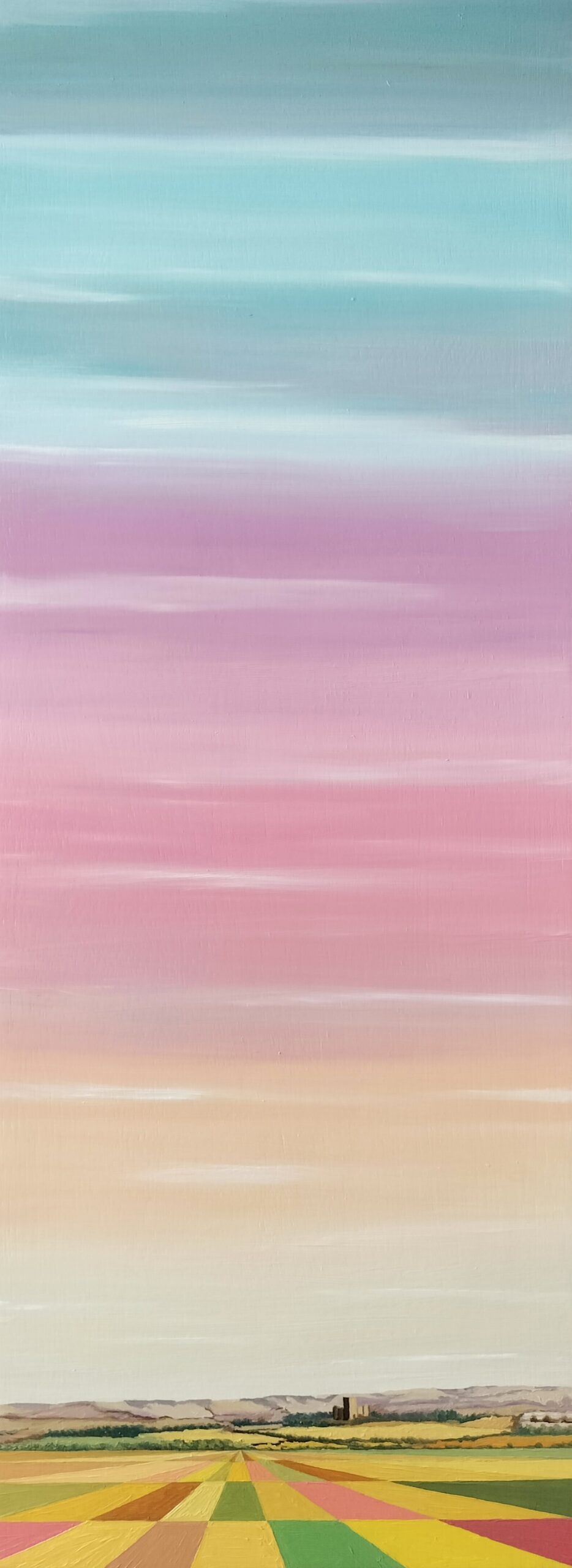 En la parte inferior, la tierra aparece organizada en campos geométricos, rectángulos y líneas que avanzan hacia el horizonte. Los colores —verdes, amarillos, ocres y toques rosados— dialogan con el cielo, creando una armonía serena entre lo natural y lo humano. A lo lejos, unas formas mínimas sugieren edificaciones o silos, pequeños testigos de presencia humana en un paisaje vasto y silencioso.
