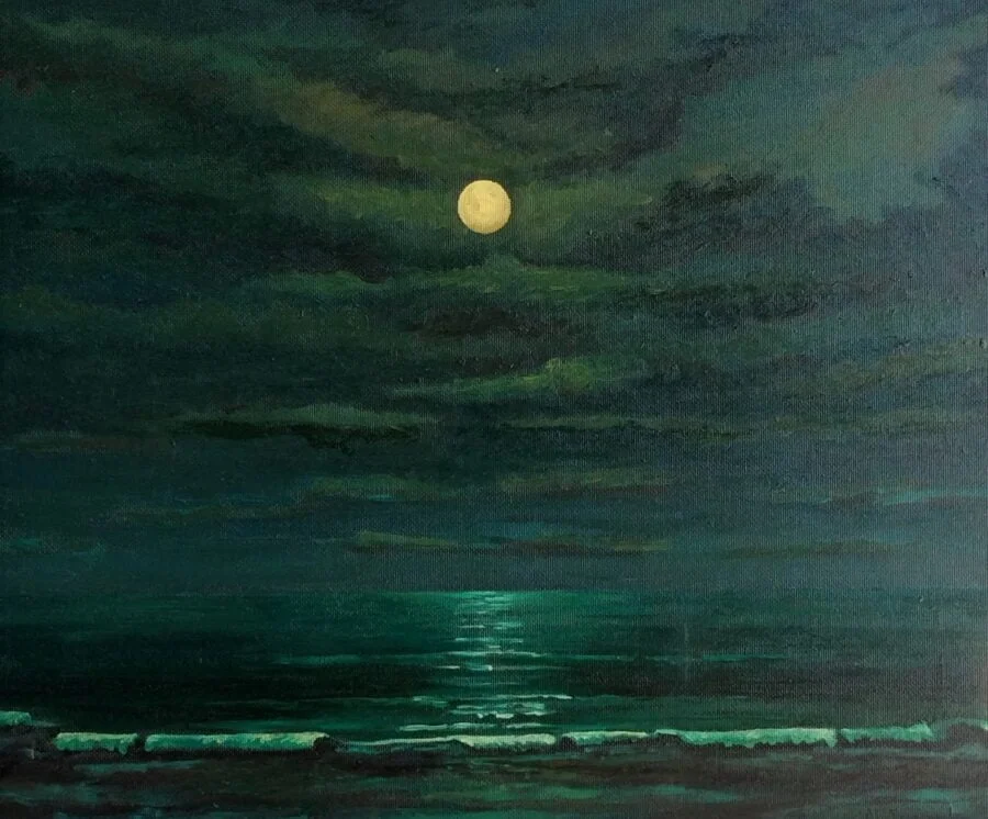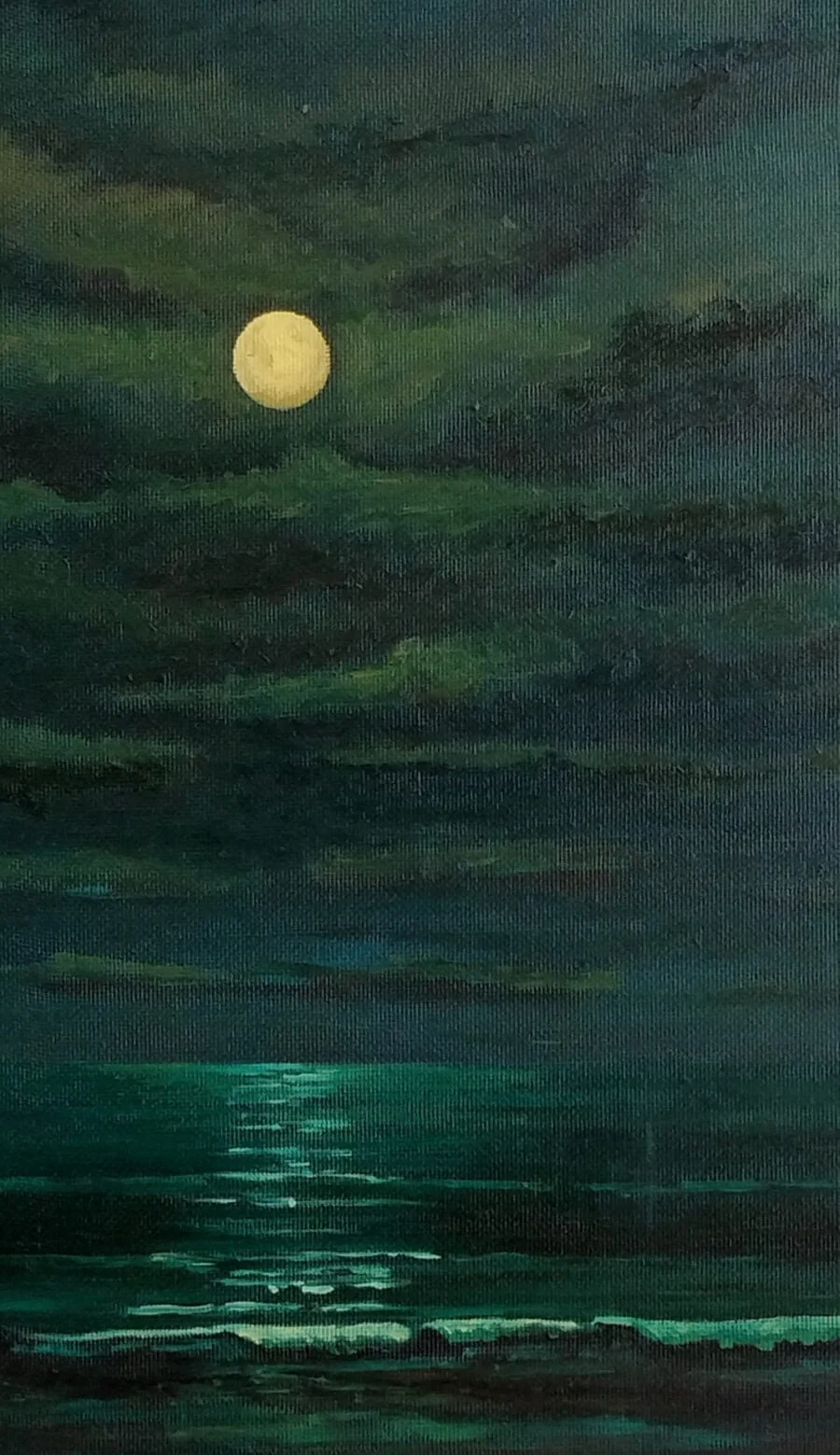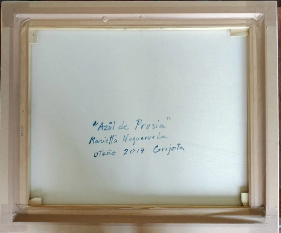 La pintura está realizada en tonos suaves en gama de azules y verdes.